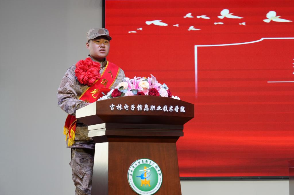 赵天赐同学作为新兵代表发言,感谢母校的培养,感恩老师和同学们的关心帮助。他表示将尽快从一名普通大学生成长为一名优秀军人,不辜负祖国和人民的期望。