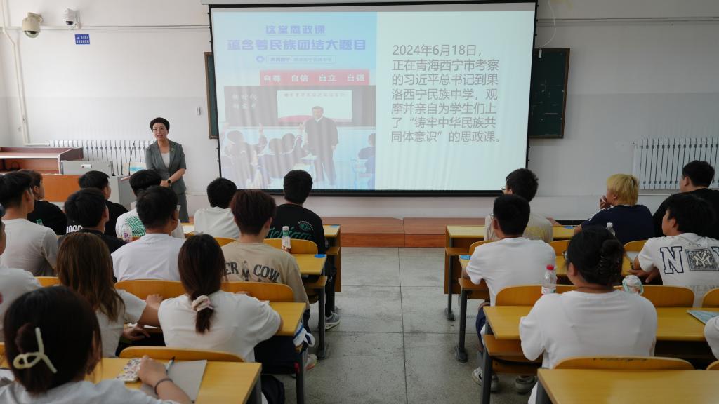 课堂上,何晓杰以“你是什么民族?”这一互动展开授课,用通俗易懂的语言分别从中华民族缘起与中华民族共同体的战略意义和怎样铸牢中华民族共同体意识两个方面进行详细讲解。她将理论与实际巧妙结合,将铸牢中华民族共同体意识与党纪学习教育相结合,通过专题纪录片引导师生严守政治规矩、强化政治意识,切实感受铸牢中华民族共同体意识的意义,增强师生铸牢中华民族共同体意识。整节课有理有据,课堂氛围活泼自然,引得在场师生掌声阵阵。