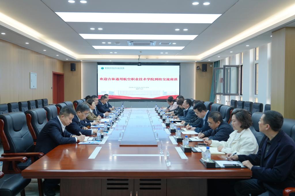 4月9日,吉林通用航空职业技术学院党委书记王洪福、副院长马辉带领学校有关职能部门负责人一行10人来校交流访问。学校党委书记何晓杰、校长曾繁明、副校长于钧、副校长张晓娟,以及相关职能部门负责人参加座谈。双方围绕职业教育改革关键议题展开深度研讨。